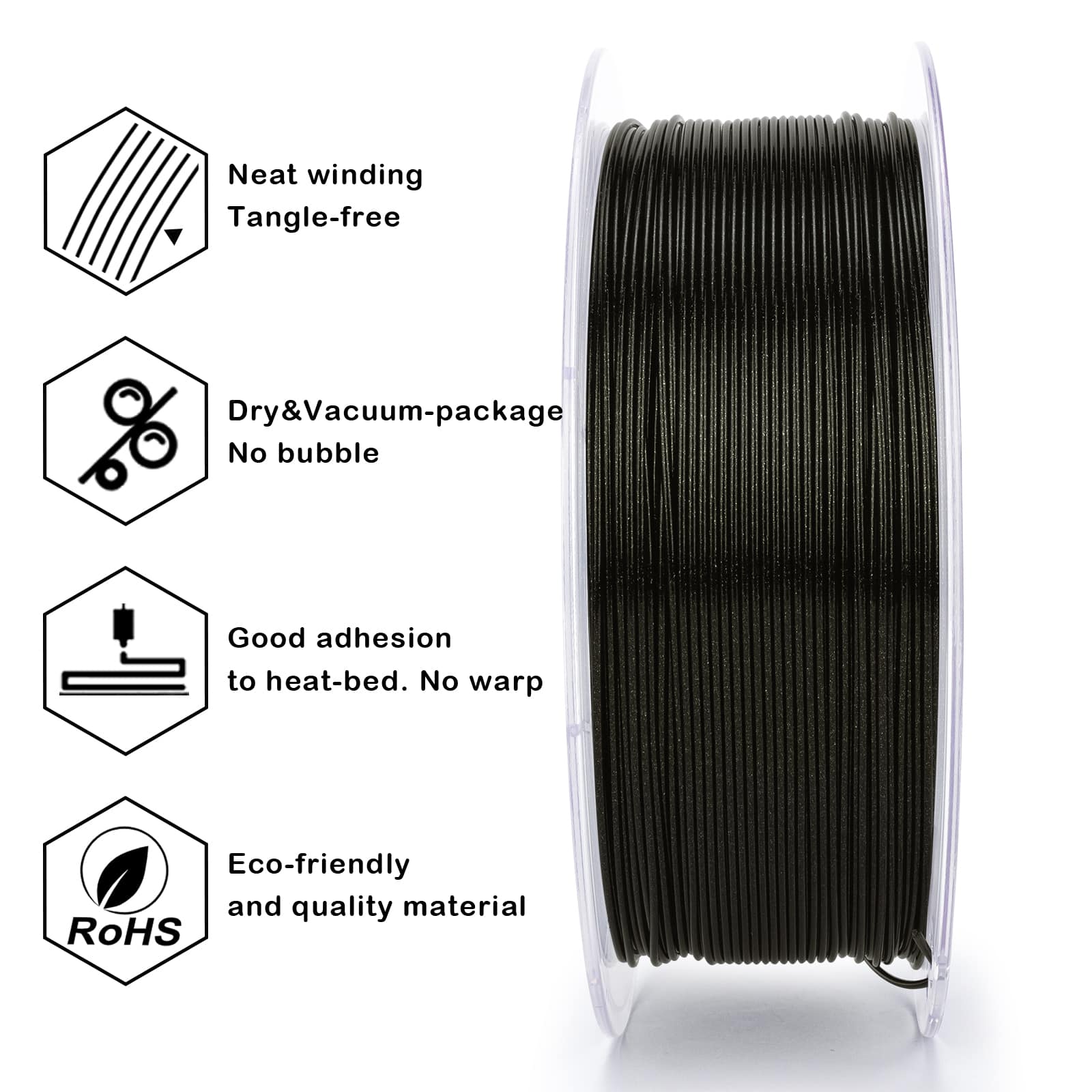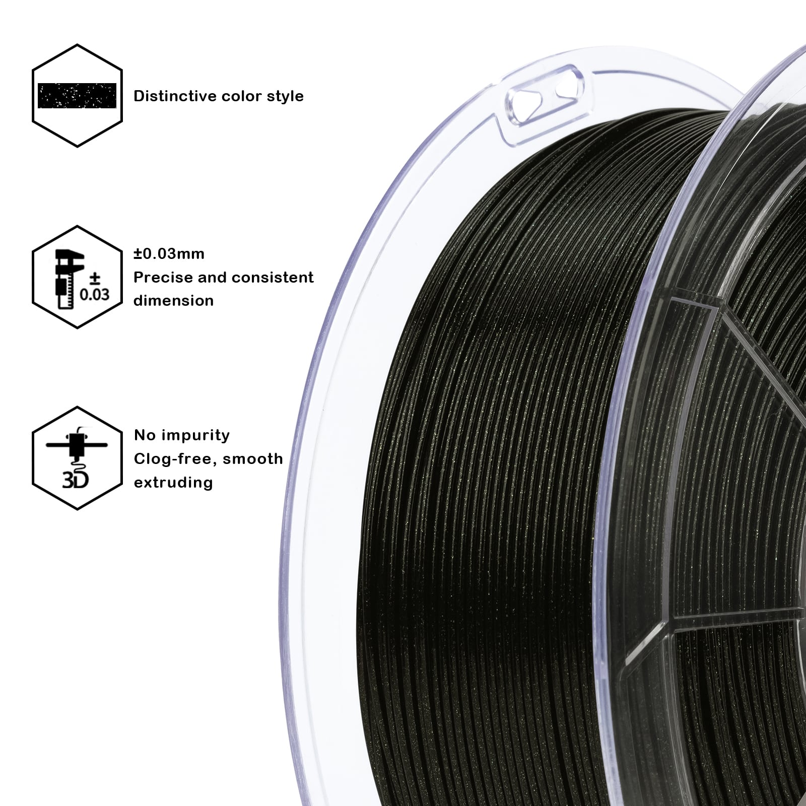 ZIRO Glitter Firefly PLA Obsidian Gold filament proizvodi se sa tolerancijom prečnika od ±0.03 mm, što omogućava stabilan protok materijala kroz ekstruder.