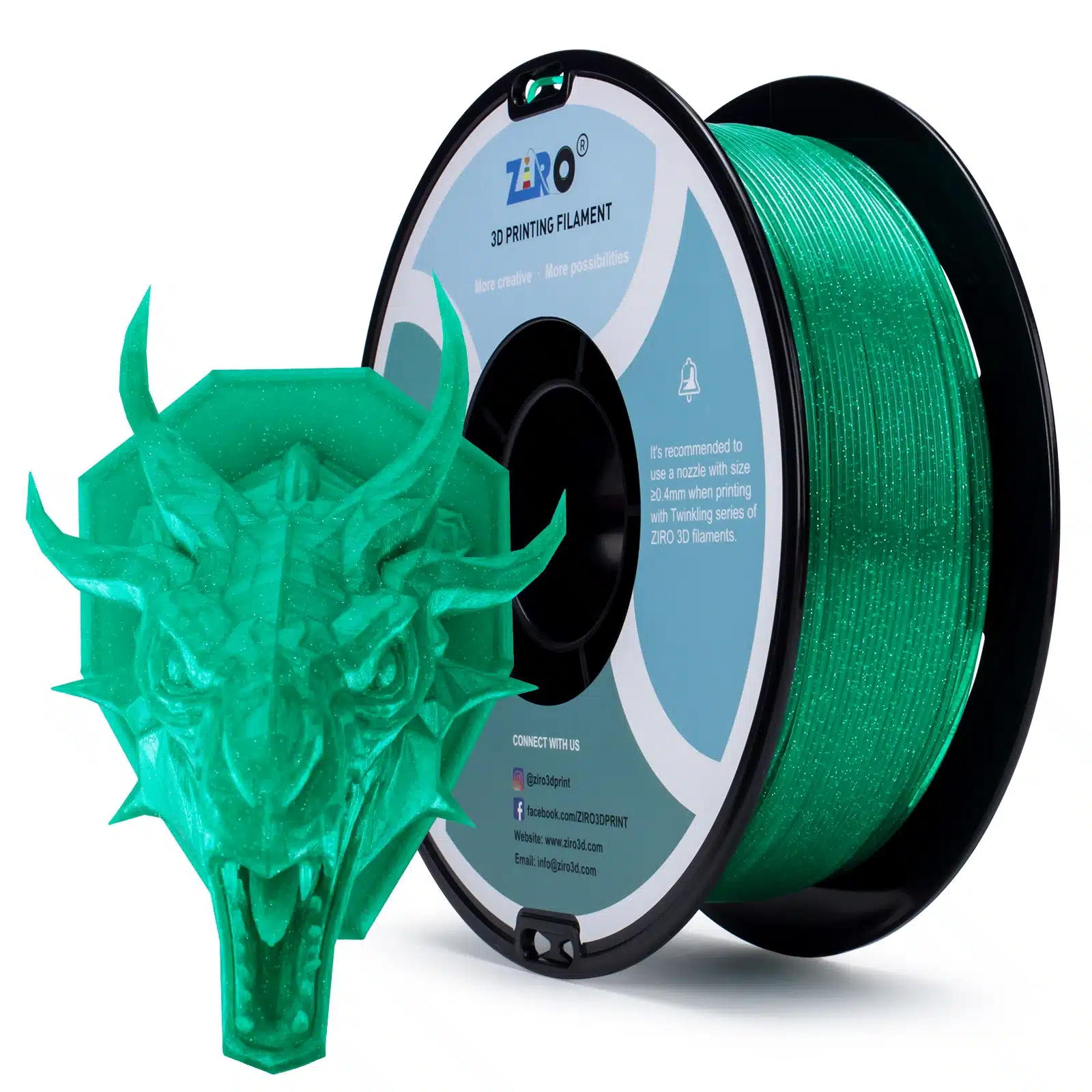 ZIRO Glitter Twinkling PLA Green kombinuje zasićenu zelenu boju sa izraženim svetlucavim česticama koje reflektuju svetlost, stvarajući bogat vizuelni efekat idealan za ukrase i kreativne projekte.