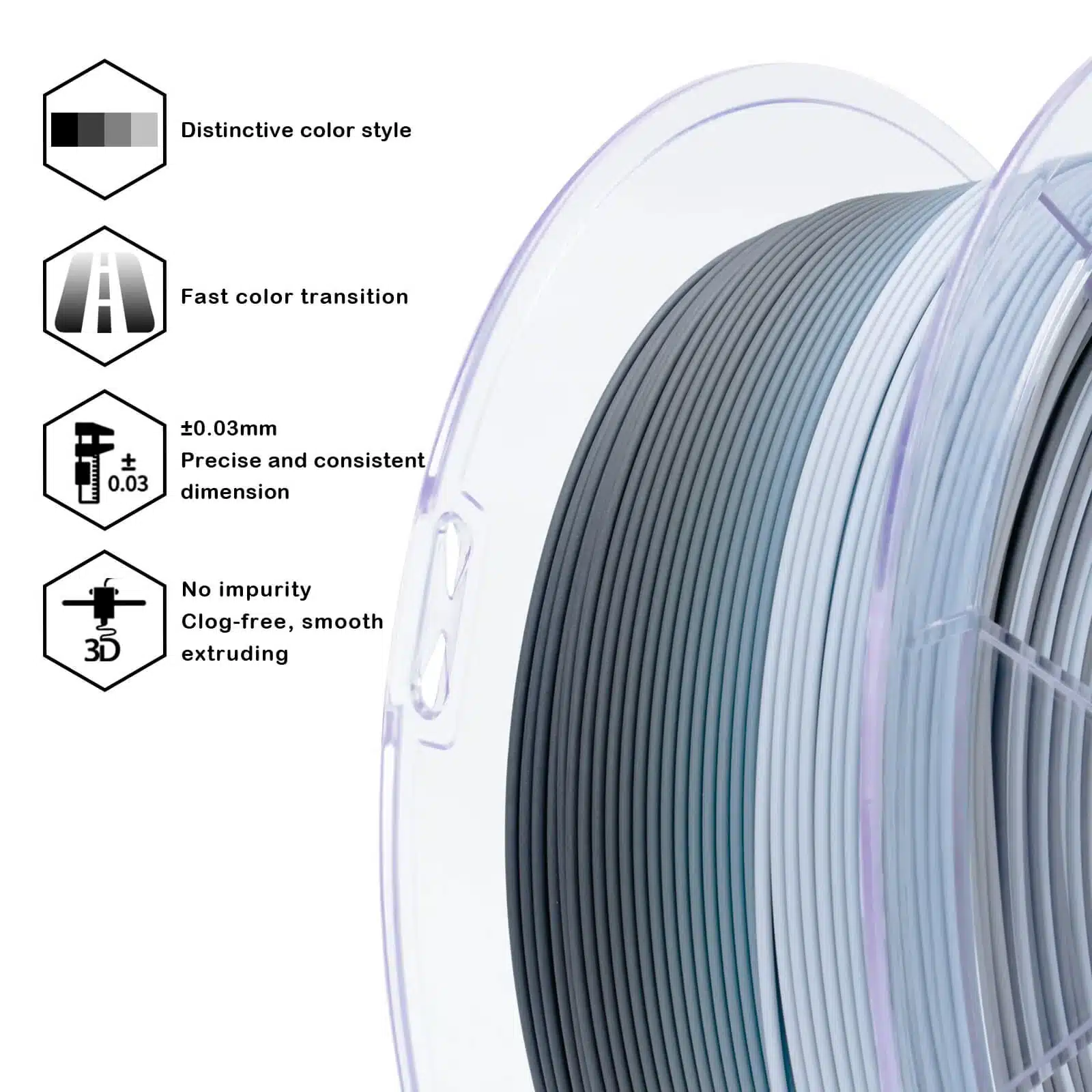 Gradient Matte PLA Gray Layer Rock filament izrađen je od visokokvalitetnog PLA materijala, bez nečistoća, što garantuje ravnomerno i stabilno istiskivanje bez zapušavanja mlaznice. Precizna kontrola prečnika (±0,03 mm) omogućava štampu bez deformacija, a upakovan je u vakumiranu ambalažu bez mehurića vazduha, spreman za upotrebu odmah nakon otvaranja.