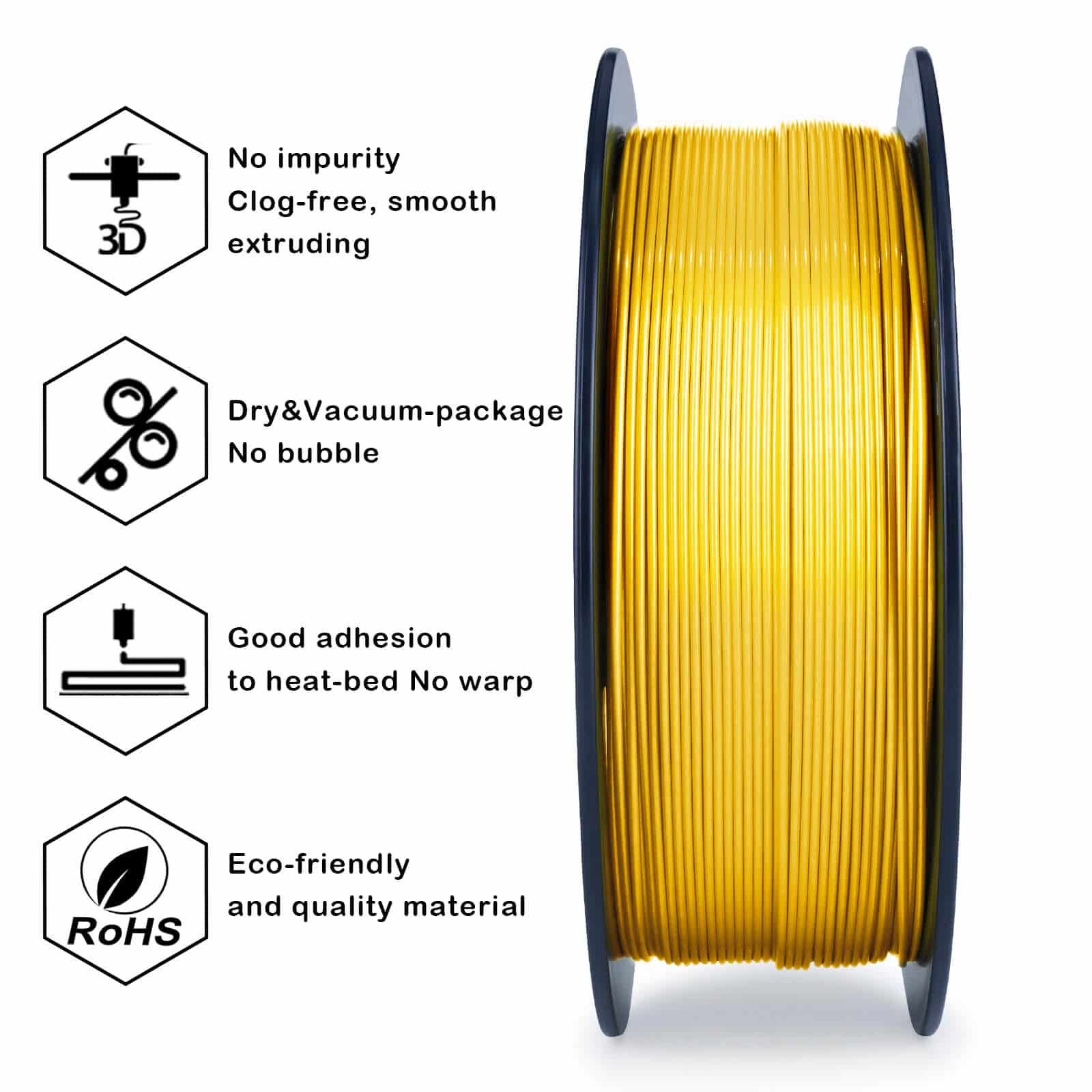 ⚠️ Metal PLA Gold ne sadrži stvarne metalne čestice — zlatni efekat postiže se pigmentima. Nije abrazivan i ne zahteva čeličnu mlaznicu.