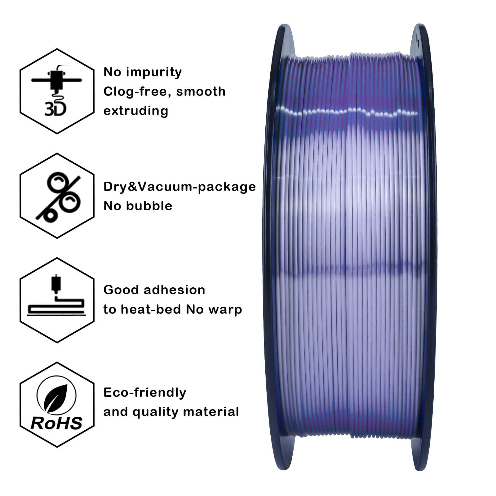 Po ponašanju u štampi, Silk PLA Violet je stabilan, odlično prijanja za različite podloge i retko izaziva warping. Nema izražen miris tokom štampe, što je pogodno za rad u zatvorenim prostorijama. Materijal je biorazgradiv (PLA osnova), ne sadrži BPA, i predstavlja bezbednu alternativu za upotrebu u obrazovnom ili kućnom okruženju.